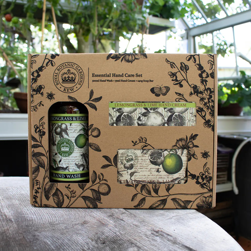 Kew Gardens Essential Hand Care Gift Box; Presented in a beautiful, fully recyclable cardboard gift box and adorned with botanical illustrations from Kew’s historical Archives.