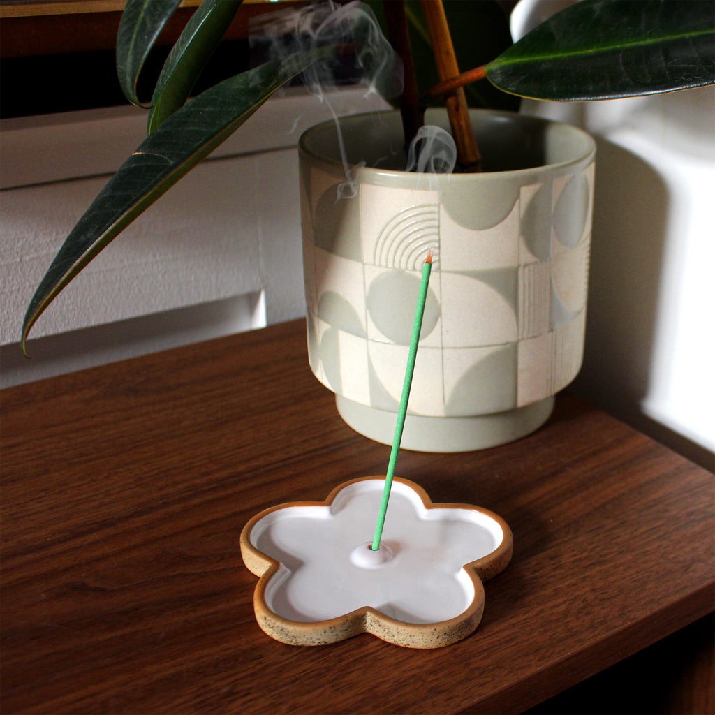 Flower-shaped ceramic incense dish.