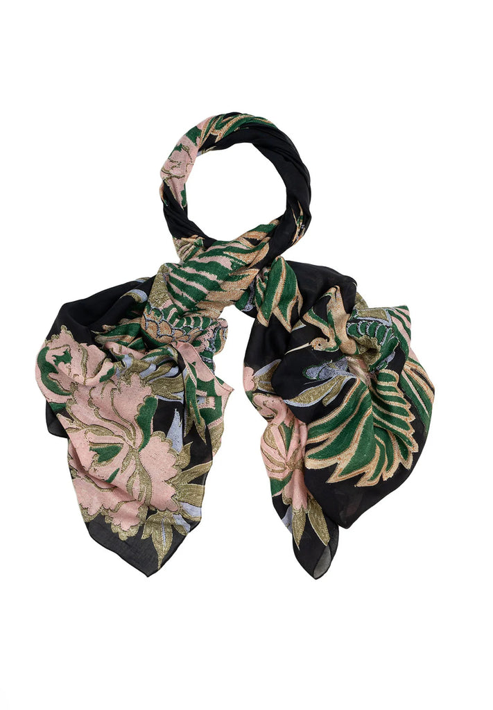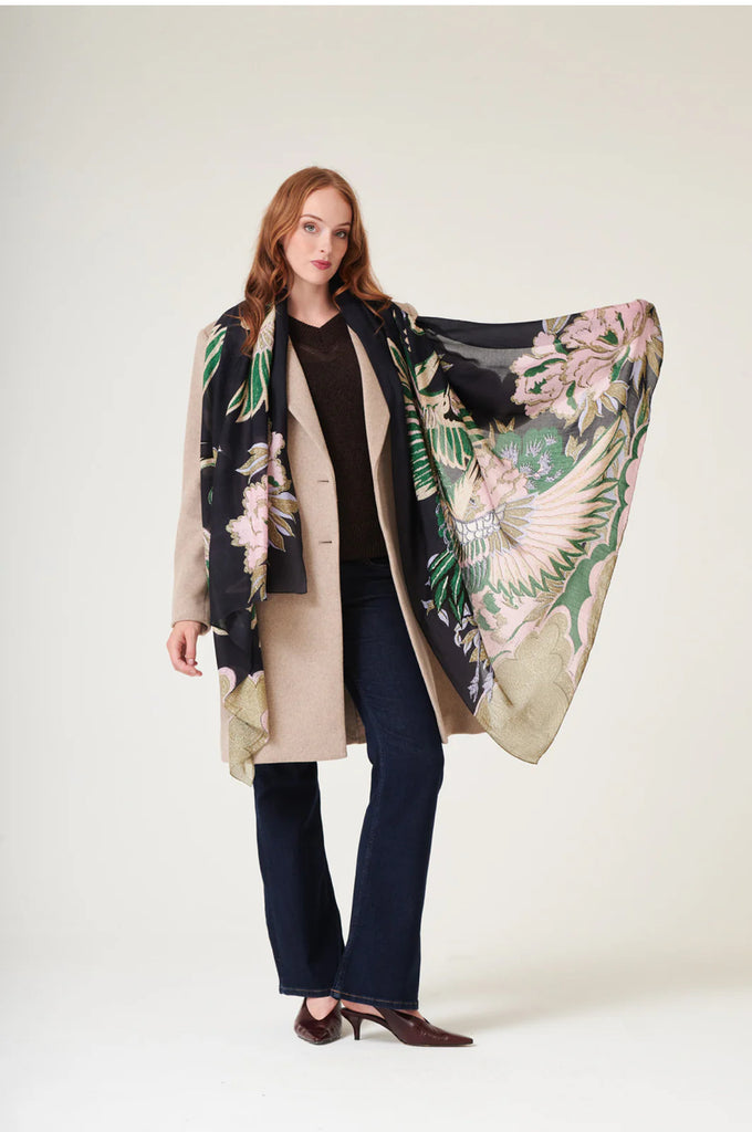 These large, graceful cranes in sand, pink and emerald, green fly across this ‘nearly black’ base.