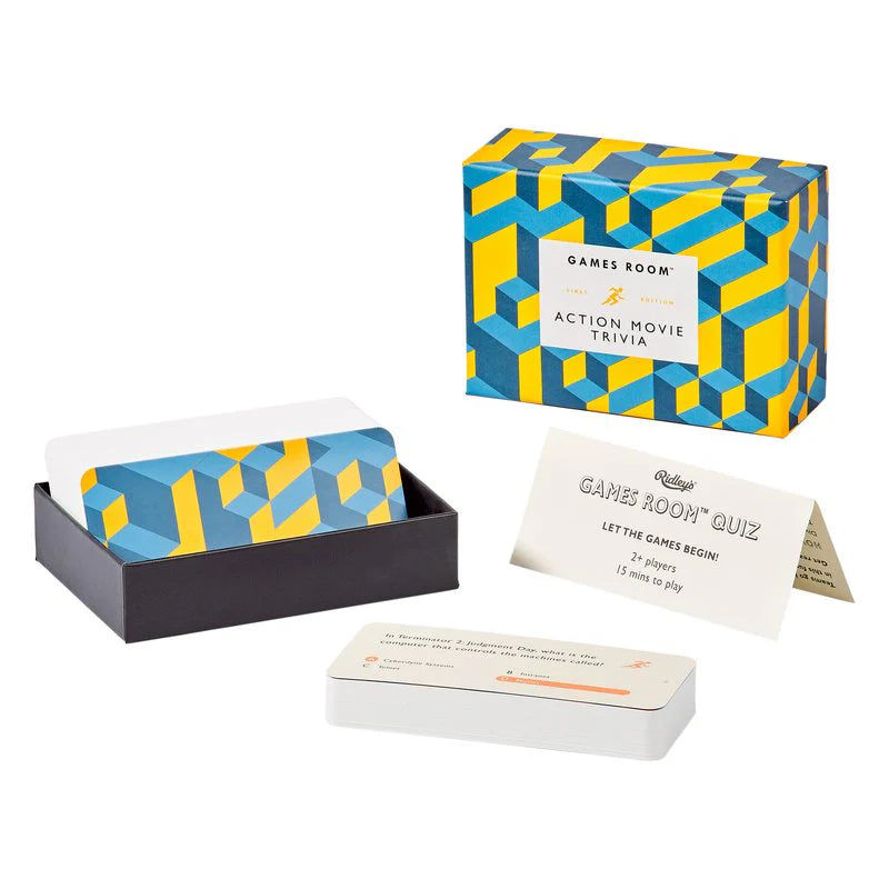 Strap yourself in for heart thumping high octane action movie trivia with this Games Room Action Film Trivia! Who will be the resourceful hero and who'll be the superfluous henchman? Test your knowledge on action films from Die Hard to Taken and see who is the ultimate action film fanatic! Packaged in a geometric print box, the set contains 140 question cards and instructions.