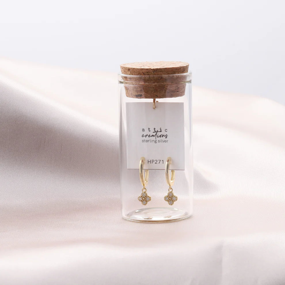 Attic Creations Hanging 4 petal sparkle flower hoop earrings - Gold