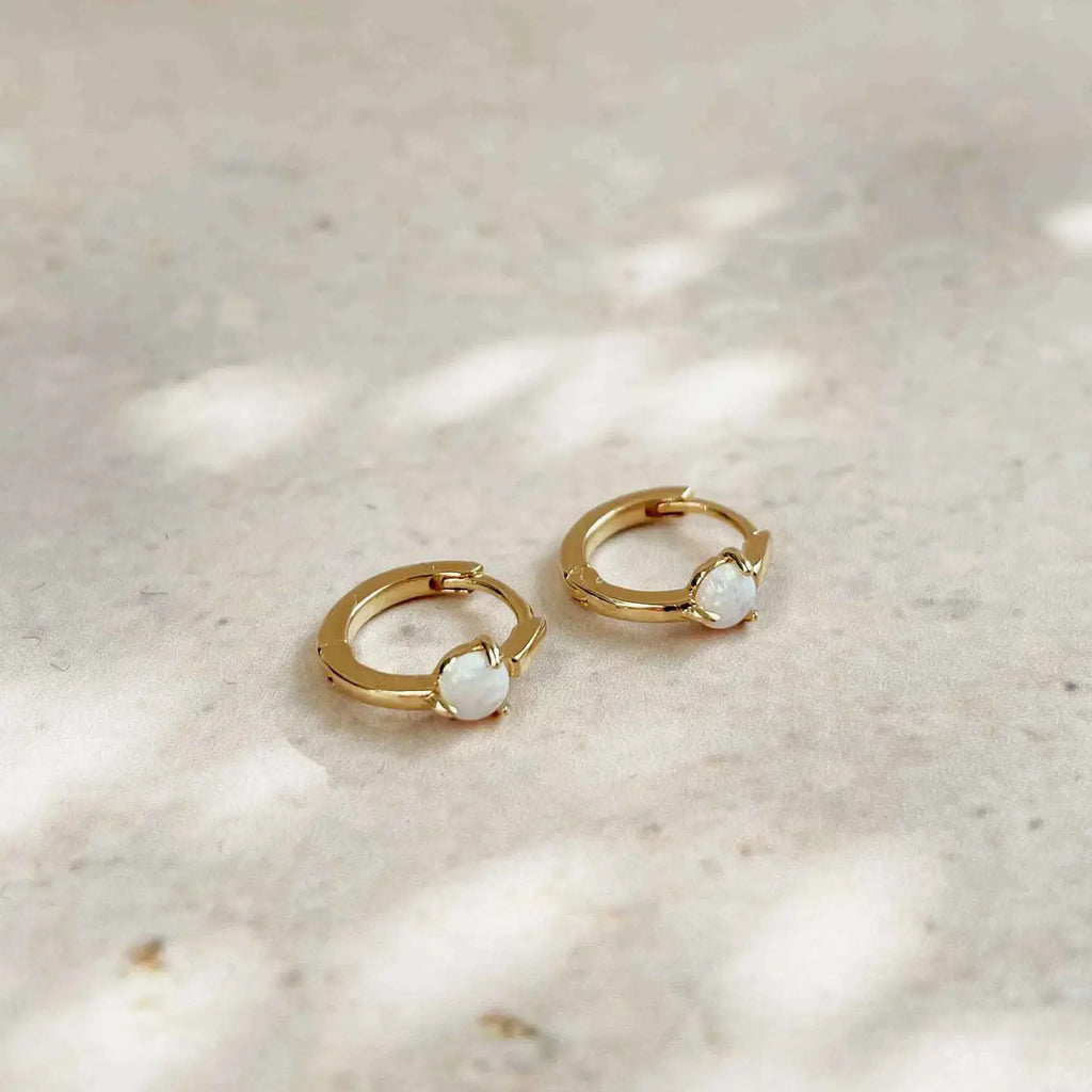 The ultimate minimal huggie. A single rounded opalite stone – known for healing – set in the center of these clicker huggies that fit snugly around the earlobe. Style them with your favourite gold hoops or let them shine on their own. Hoop Size: 11mm Stone Size: 3mm ~ Every order ships in a luxury protective box ~ All packaging is eco friendly and recycled