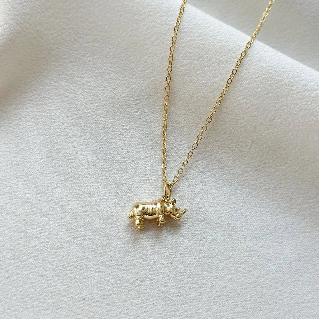 18k gold plated fine chain necklace with detailed Rhino pendant design. 16inch chain plus 2 inch extension .Hypoallergenic. Presented on a recyclable branded backing card. Designed in the UK.
