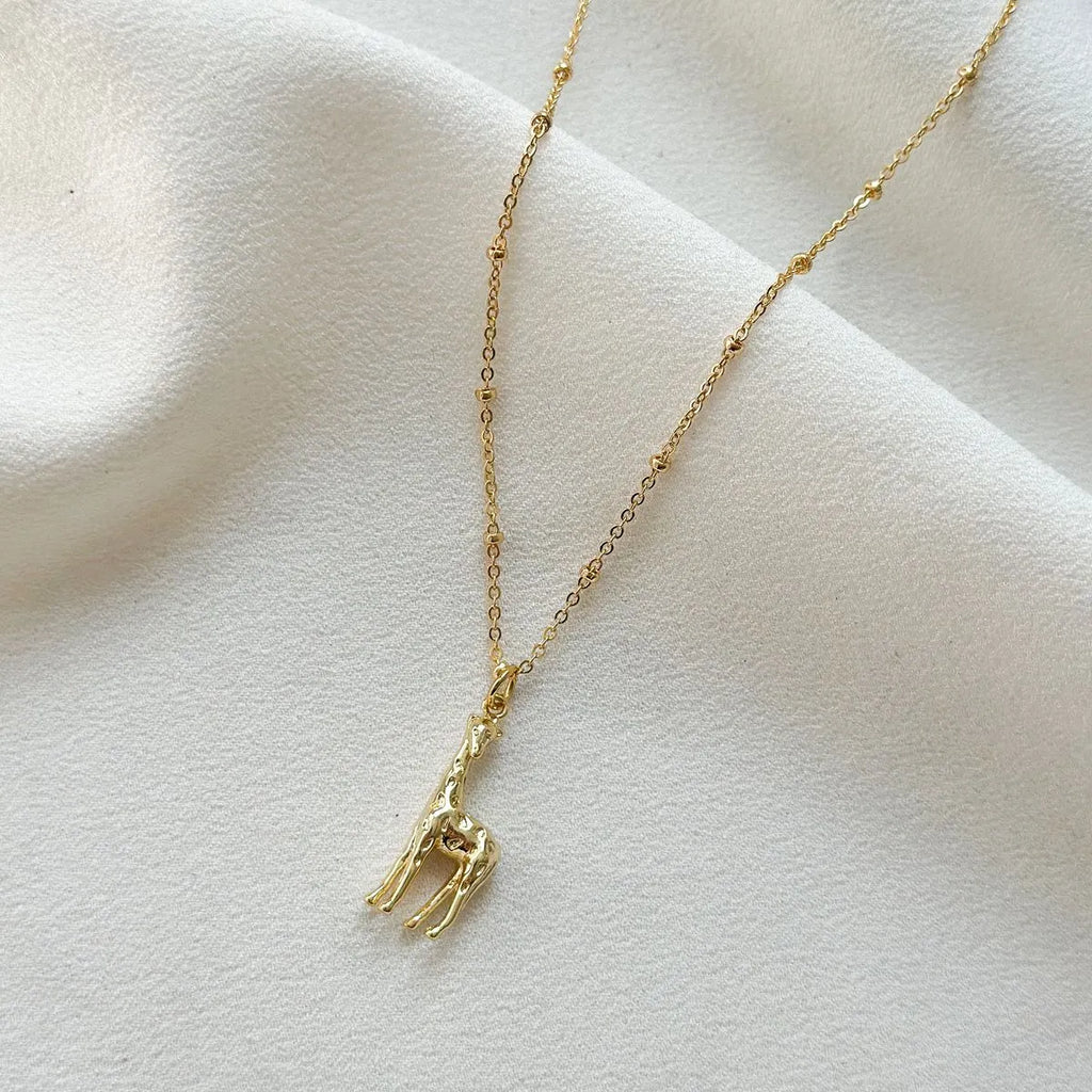 18k gold plated satellite chain necklace with detailed giraffe pendant design. 16inch chain length + 2inch extension.