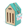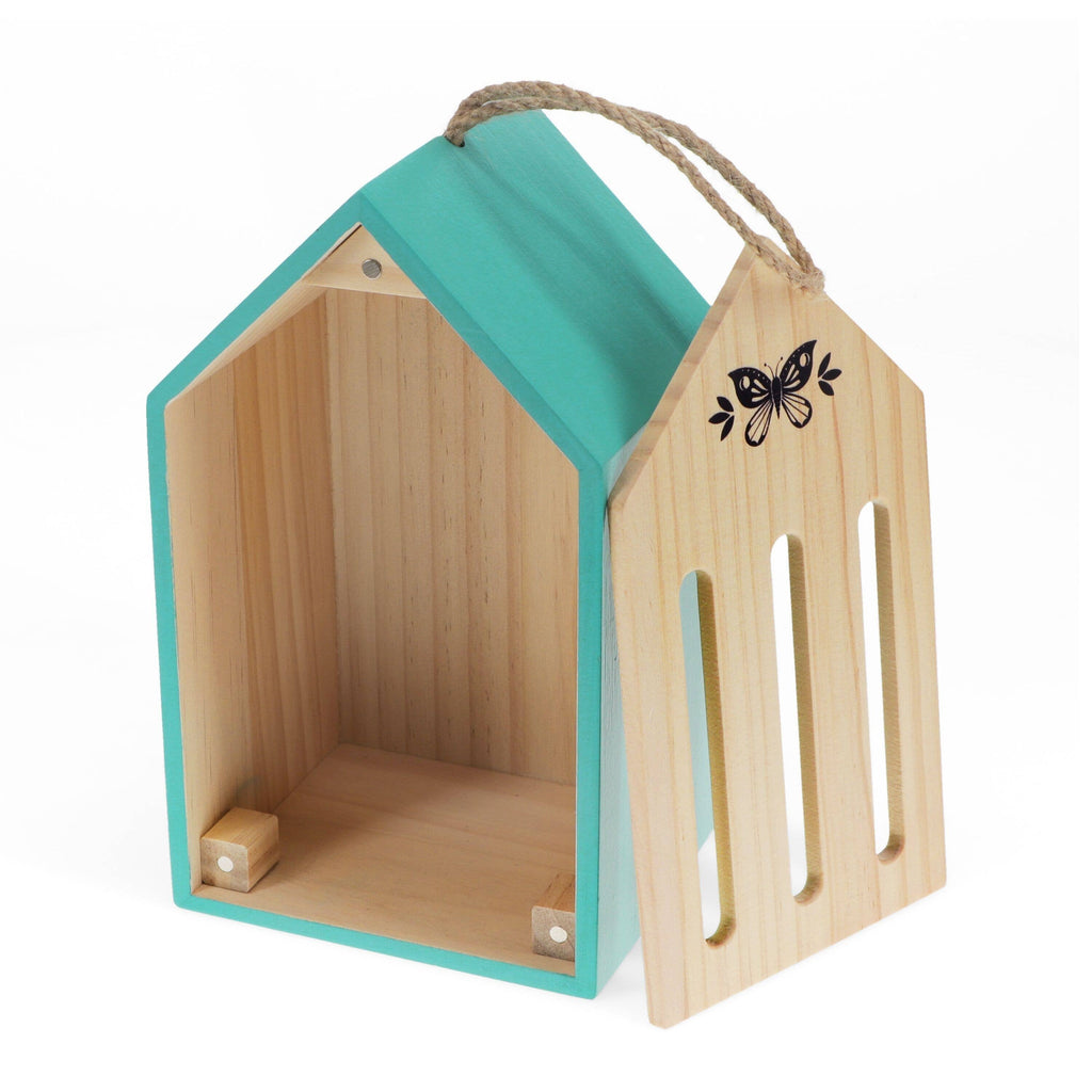 Wooden bug hotel with blue-painted exterior and natural coloured interior and entrance cover. It's perfectly suited to providing a safe and cosy resting place for butterflies in gardens or outdoor spaces.