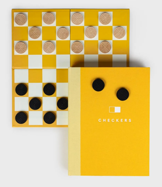 Open up this hardback, cloth-covered book and you'll find a board, and pieces neatly stashed within the pages. Checkers AKA Draughts is a classic for all ages that offers endless opportunities for friendly competition. When the game is over, display the set on your bookshelf or coffee table. Pages include rules of the game in four languages.