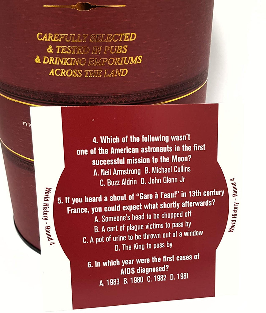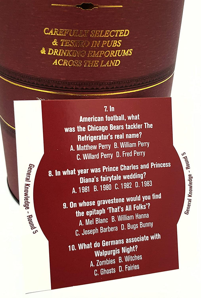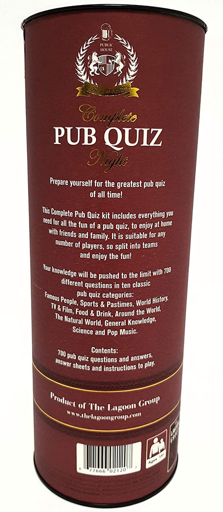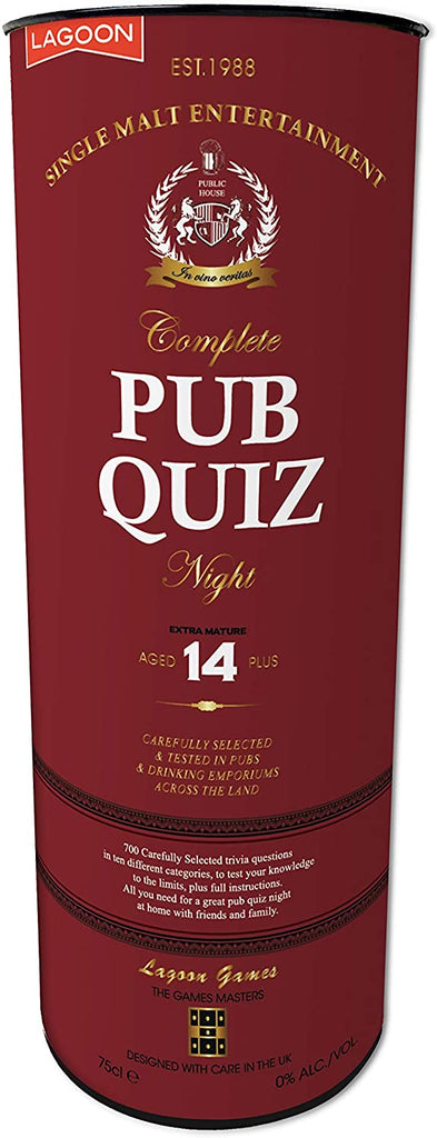 Enjoy your own pub quiz from the comfort of your living room with The Complete Pub Quiz from Lagoon that contains everything you need for an entertaining games night with friends and family. Presented in an elegant whiskey-style gift tube, this is a perfect gift at a party or to use as the evening’s entertainment. Featuring 700 fun trivia questions, answer booklets and score sheets, all you need to do is pick your teams and appoint a quizmaster to preside over the evening. With a whole variety of pub quiz rounds from General Knowledge, Sports, History and Pop Culture there really is something for everyone in this quiz as the teams compete against each other to be pub quiz champion! Perfect for 2 or more players or team, ages 14 years and over.