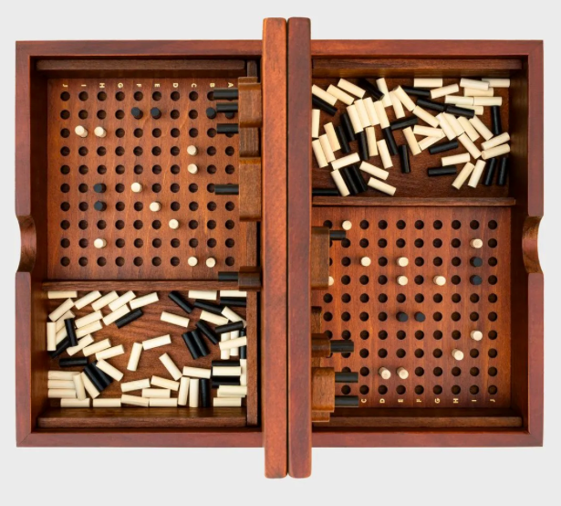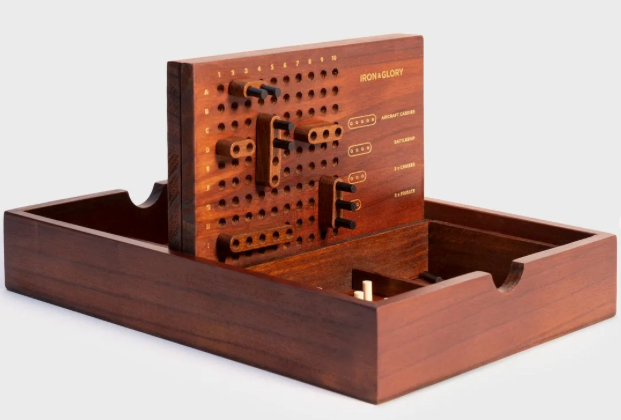 Iron & Glory wooden sinking ships game. Deluxe wooden two-player strategy game. Includes 240 hit & miss pegs and 12 ships. Full instructions and playing rules included. All in one design, the box forms the board. A two player game of Naval Battle. Take turns to try and sink your opponent's ships in a complex and deadly game of cat and mouse.