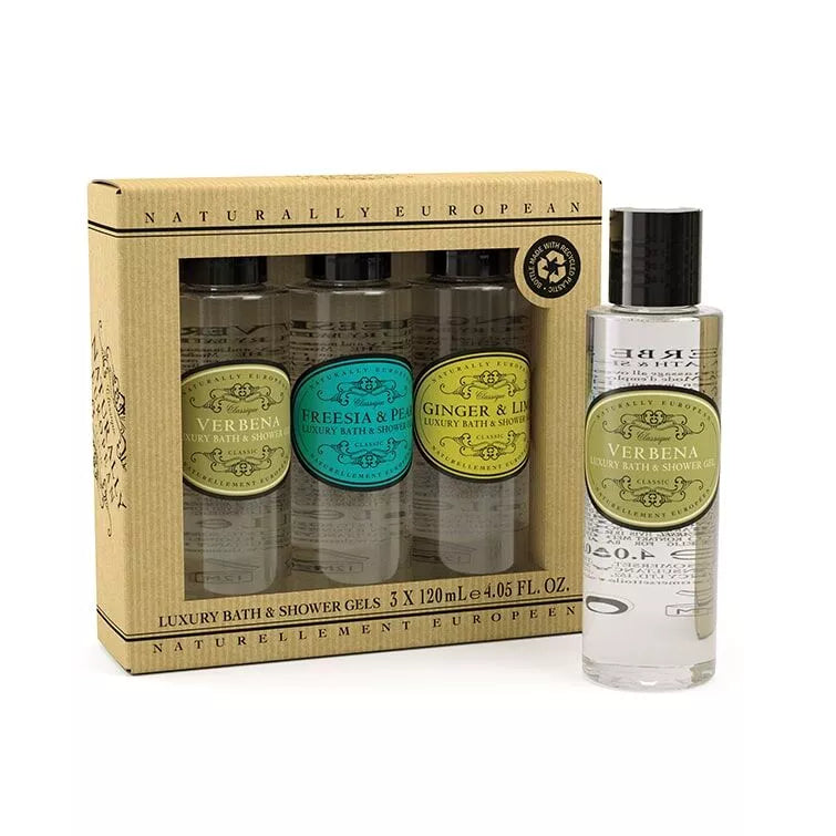 This beautiful gift set presents three luxurious Naturally European shower gels in a stylish gift box. Containing three fabulous fragrances: Verbena, Freesia and Pear and Ginger & Lime.