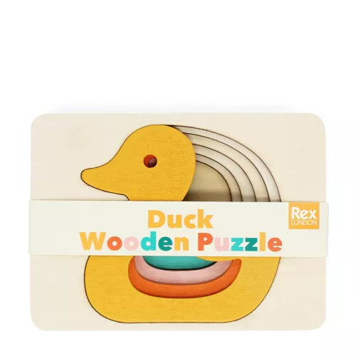 Fun and simple wooden puzzle for children, featuring five duck pieces in different colours and sizes, and a tray to slot them into. A great first puzzle for little ones – the aim is to stack the ducks in layers, in the correct order, from smallest to largest. Perfect for developing their motor and problem-solving skills, together with their hand-eye coordination, shape and colour recognition.